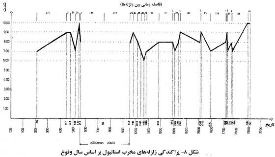 بین سالهای (2100 قبل از میلاد -1900 بعد از میلاد) تا به امروز 1175 مورد زلزله در آناتولی و اطراف آن ثبت شده است. محدوده زلزلههای روی داده در بین َ45 -ْ25 شرق طول جغرافیایی وَ35 –ْ 33شمال عرض جغرافیایی قرار گرفته است. نمودار شكل 8 براساس شدت مركز زلزله و زمان وقوع زلزلههای استانبول در بین سالهای 212 -1912 بعد از میلاد، مرتب و تنظیم شده است. این نمودارنشان میدهد كه از تاریخ 212 میلادی تا به امروز، در یك دوره 150 تا 200 ساله زلزله بزرگی روی نمیدهد ولی در 15 تا 20 سال بعد امكان وقوع زلزلههای مخرب وجود دارد.